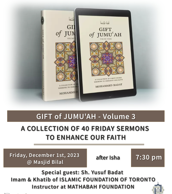 It gives us great pleasure to inform you that alhamdulillah through the grace and mercy of Allah, our Imam’s newest publication ‘Gift of Jumu’ah – Volume 3′ will soon be published and we’re looking forward to the launch with special guest: Shaykh Yusuf Badat – Imam & Khatib of Islamic Foundation of Toronto on Friday, December 1st, 2023, after the Isha prayers (7:30 pm) In Sha’ Allah.